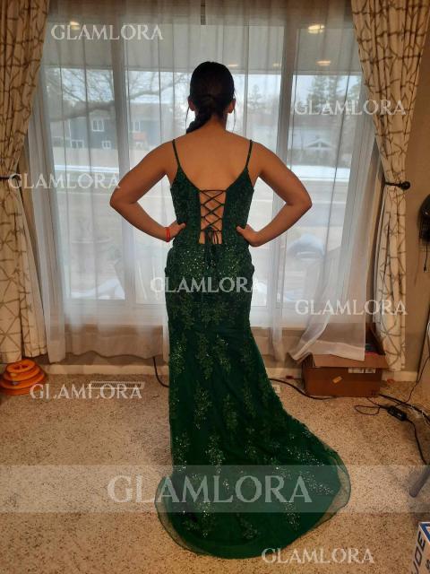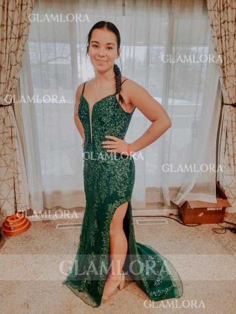 Sheath/Column Straps Splendid Sleeveless Sweep Train Lace Corset Prom Dress With Slit #GLWH0619