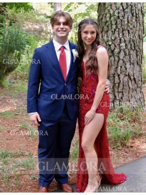 • Sheath/Column Straps Splendid Sleeveless Sweep Train Lace Corset Prom Dress With Slit
