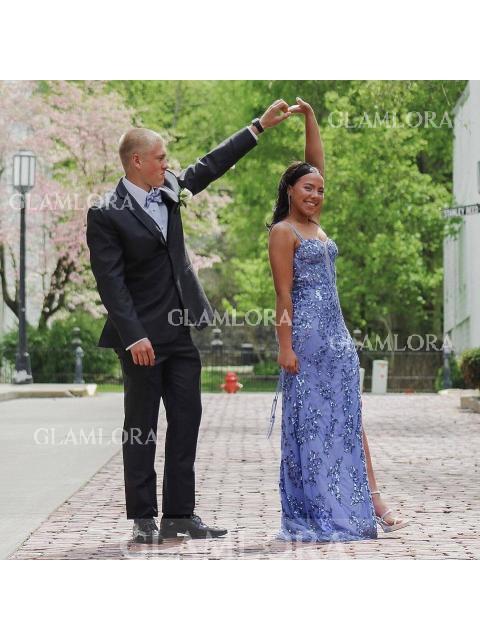 Sheath/Column Straps Splendid Sleeveless Sweep Train Lace Corset Prom Dress With Slit - Glamlora