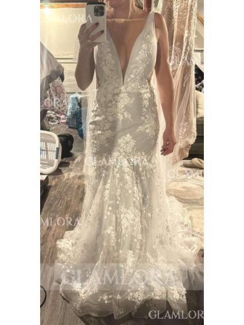 • Sheath/Column V-Neck Classy Sleeveless Chapel Train Tulle Wedding Dress With Applique