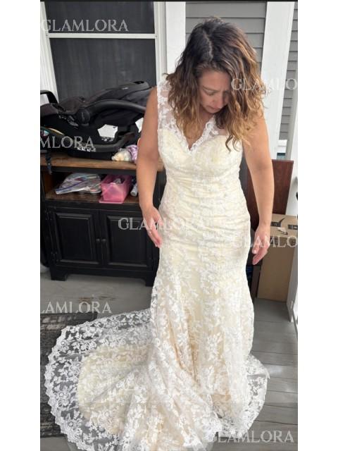 • Sheath/Column V-Neck Sleeveless Chic Court Train Lace Wedding Dress
