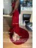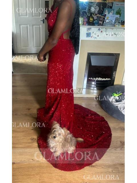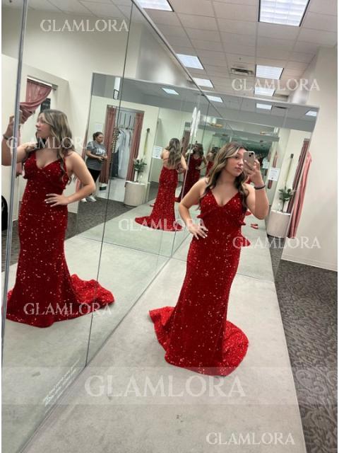 • Sheath/Column V-Neck Sleeveless Sweep Train Glimmering Velvet Sequins Prom Dress