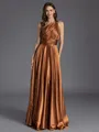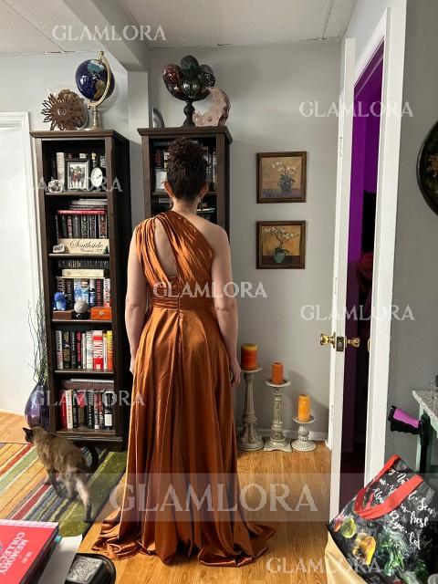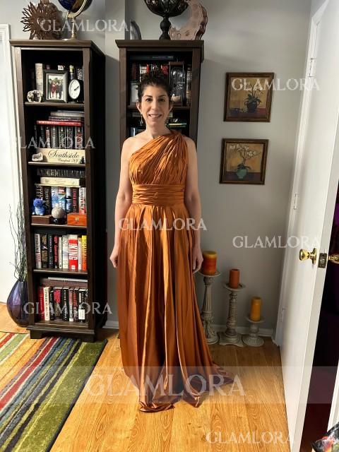 An A-line bridesmaid dress with a chic one-shoulder design and sleeveless cut. Made from silk-like satin, this floor-length dress features pleated details that create a flattering and elegant silhouette, perfect for a refined and timeless look.