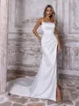 This sleek sheath wedding dress features delicate spaghetti straps and a sleeveless design that beautifully accentuate the shoulders. Made from luxurious charmeuse fabric, the bodice is detailed with elegant pleats that add subtle texture and sophistication. The fitted corset waist enhances the silhouette, while the chapel-length train trails gracefully, creating a refined and timeless bridal look.