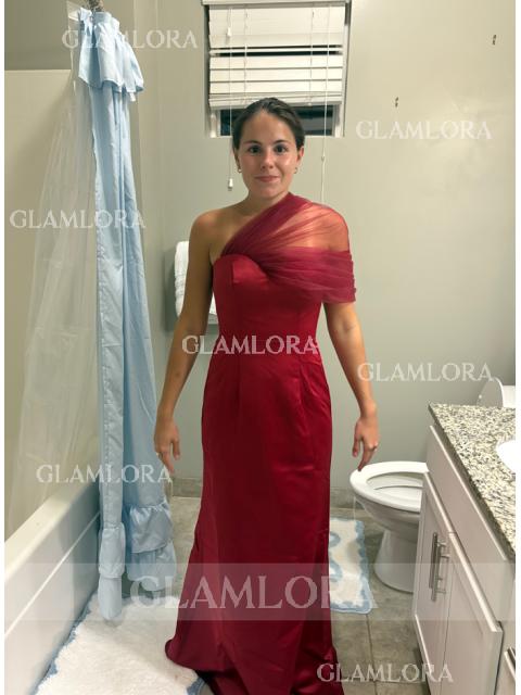 A sleek and sophisticated sheath bridesmaid dress featuring a V-neckline and short sleeves. Crafted from luxurious satin, this dress offers a smooth, figure-hugging fit that enhances the natural shape. The sweep train adds a touch of elegance and movement, making it perfect for a modern yet timeless wedding look.