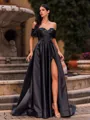 A stunning A-line prom dress featuring an off-the-shoulder, sleeveless design with delicate pleating. Made from smooth satin, the flowing skirt extends into a graceful sweep train, creating an elegant and sophisticated silhouette perfect for formal events and special occasions.