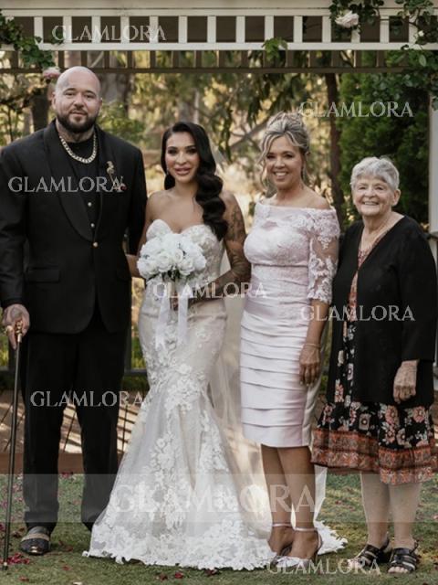 This mother of the bride dress features a sheath silhouette with an off-the-shoulder neckline and 3/4 sleeves. It is adorned with appliques lace and crafted from satin, with a knee-length design for a sophisticated and elegant look.