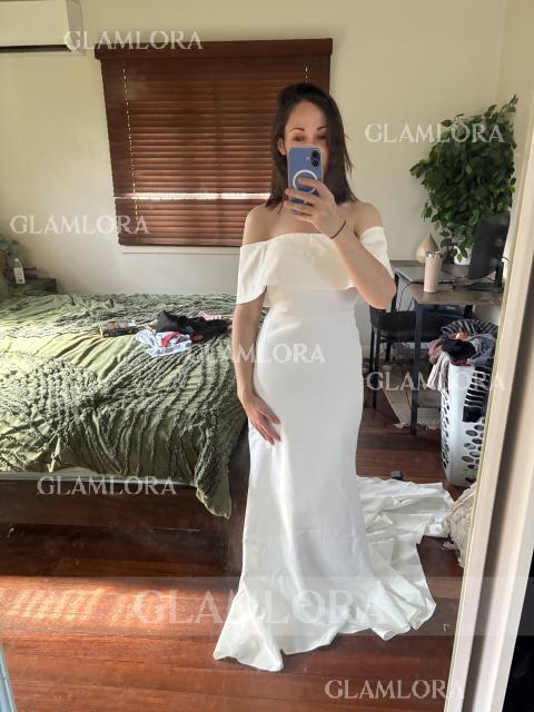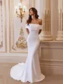 • Sophisticated Sheath Off-the-Shoulder Cathedral Train Stretch Crepe Wedding Dress
