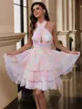 This Glamorous a-line halter mini dress is perfect for relaxed summer outings, parties, vacations and more. The cross-over halterneck design emphasizes the shoulders and neck while maintaining comfortable support. The soft macaron gradient color and layered ruffles create a dynamic and lively look, perfect for photos. The lightweight fabric and high waist design naturally flatter your figure and create a visually elongated effect. The hem sways with the wind as you walk, creating a light and flowing look. The concealed waist creates a snug fit. This halter ruffles dress combines practicality with everyday style, perfect for both daily scenes and light occasionwear.