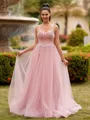 This breathtaking A-line dress features a flattering sweetheart neckline and is sleeveless for a chic, modern look. Adorned with intricate lace applique, the dress exudes elegance and romance. Made from soft, flowing tulle, it offers a delicate and airy feel, while the corset-style bodice enhances the figure, creating a stunning silhouette. The sweeping train adds a touch of drama and sophistication, making it perfect for weddings or other formal occasions. The combination of lace, tulle, and the elegant design creates a timeless and graceful appearance.