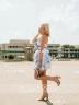 Blue floral print for a naturally soft feel. Short hem for easy walking and dancing.
