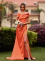 • Splendid Sheath Scoop Pleated Sweep Train Silk like Satin Bridesmaid Dress