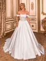 This breathtaking ball-gown wedding dress features a romantic off-the-shoulder neckline and a sleeveless design. Crafted from luxurious satin and adorned with delicate lace appliques, it is designed with a structured corset bodice for a flattering fit and flows into a dramatic cathedral train, creating a timeless, fairytale-inspired bridal silhouette.