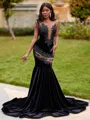 This elegant mermaid dress features a scoop neckline and a sleeveless design, offering a chic and sophisticated look. Adorned with delicate lace appliques, the dress adds intricate detailing that enhances its romantic charm. Crafted from luxurious velvet, the fabric provides a rich, smooth texture that hugs the body, accentuating curves and creating a flattering silhouette. The sweep train adds a graceful and dramatic touch, making this gown perfect for formal events or weddings. The combination of lace appliques, velvet, and the mermaid silhouette creates a stunning, timeless appearance full of elegance.