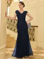 • Splendiferous Sheath/Column Tulle Applique V-Neck Short Sleeves Floor-Length Mother of the Bride Dresses