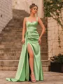 A splendiferous sheath prom dress crafted from smooth, silk-like satin, featuring elegant pleated detailing and delicate straps. The sleeveless design highlights its refined silhouette, while the sweep-train hem creates a graceful, sophisticated look perfect for making a stylish entrance.