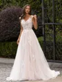 Statuesque A-Line/Princess Lace Applique V-Neck Sleeveless Sweep/Brush Train Wedding Dress - Glamlora