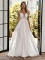 This stunning A-line wedding dress features an illusion neckline and sleeveless design that beautifully blend elegance with modern style. Crafted from soft tulle, the bodice is adorned with delicate lace appliques that create a romantic and intricate look. The corset waist cinches the figure for a flattering silhouette, while the sweep-length train flows gracefully behind, perfect for a timeless and graceful bridal appearance.