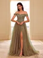 A stunning A-line dress with an off-the-shoulder, sleeveless design, crafted from delicate tulle and adorned with intricate lace appliques. The corset bodice enhances the silhouette, while the sweep train adds an elegant and graceful finish. Perfect for weddings or formal occasions.