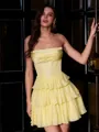 This A-line dress features a straight neckline and a sleeveless corset bodice that shapes and defines the waist. Made from lightweight chiffon, the skirt is adorned with cascading ruffles that add texture and movement. The short or mini length creates a youthful and elegant look, perfect for parties, proms, or special occasions.