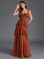 An A-line bridesmaid dress with delicate straps and a sleeveless design. Featuring cascading ruffles for a romantic and flowing look, this floor-length chiffon dress adds elegance and movement, making it perfect for any formal event.