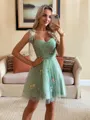 A-line lace dress with delicate straps and floral accents, offering a charming short/mini style.