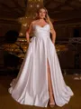This plus size A-line wedding dress features a romantic sweetheart neckline and sleeveless design, with a fitted corset bodice. The pleated satin skirt flows gracefully into a sweep train, creating a flattering and elegant bridal look.