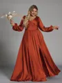 This A-line bridesmaid dress features a flattering V-neckline and elegant long sleeves. Crafted from a blend of satin and chiffon, it offers a smooth, flowing finish with delicate pleats for added texture. The floor-length skirt creates a graceful and sophisticated silhouette-perfect for plus size bridal parties.