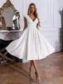 • Stunning A-line V-Neck Short Sleeves Pleated Knee-Length Stretch Crepe Wedding Dress