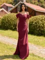 A stylish sheath bridesmaid dress in stretch crepe, featuring cold shoulder design, pleated details, and a sweep train.