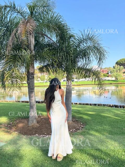 This sophisticated sheath wedding dress features a sleek silhouette that gently hugs the body. Made from luxurious silk-like satin, it offers a smooth and elegant finish. The halter neckline beautifully frames the shoulders and neckline, while the sleeveless design keeps the look fresh and modern. A graceful court-length train adds a touch of timeless elegance, perfect for a refined and memorable bridal appearance.