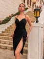 A stunning sheath homecoming dress crafted from soft, stretchy jersey, featuring elegant pleated detailing and a flattering V-neckline. The sleeveless design and knee-length silhouette create a chic, modern look perfect for making a stylish, confident entrance with effortless grace.