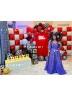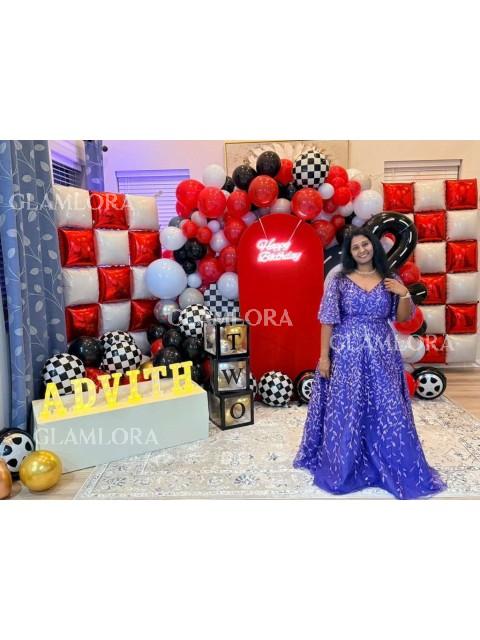A timeless A-line Mother of the Bride dress featuring a V-neckline and short sleeves. The dress is elegantly adorned with appliqu