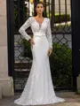• Tasteful Sheath/Column Lace Hand-Made Flower V-Neck Long Sleeves Sweep/Brush Train Wedding Dress