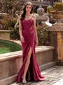 Embrace sophistication in this sheath dress with spaghetti straps, a sleeveless design, and chic pleats. The dress is elegantly completed with a sweeping train, offering a stylish and timeless look.