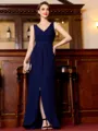 • Timeless Sheath Stretch Crepe Ruched V-Neck Sleeveless Floor-Length Mother of the Bride Dress