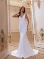 Sleeveless sheath wedding dress with a V-neckline, lace appliques, and a court train in stretch crepe fabric.