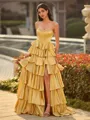 Trendy A-line Straight Cascading Ruffles Sweep Train Silk Like Satin Corset Prom Dress