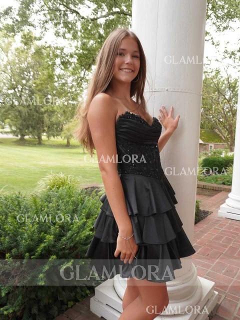A-line silhouette chiffon corset dress with a sweetheart neckline, sleeveless construction, and cascading ruffles that add movement and volume; designed in a short/mini length for a fresh appearance.
