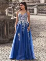 This dress is an A-line style with a V-neckline and a sleeveless design. It is adorned with delicate appliques lace and has a floor-length hem made of tulle, creating a romantic and timeless look. The dress is designed to provide an elegant and graceful appearance.