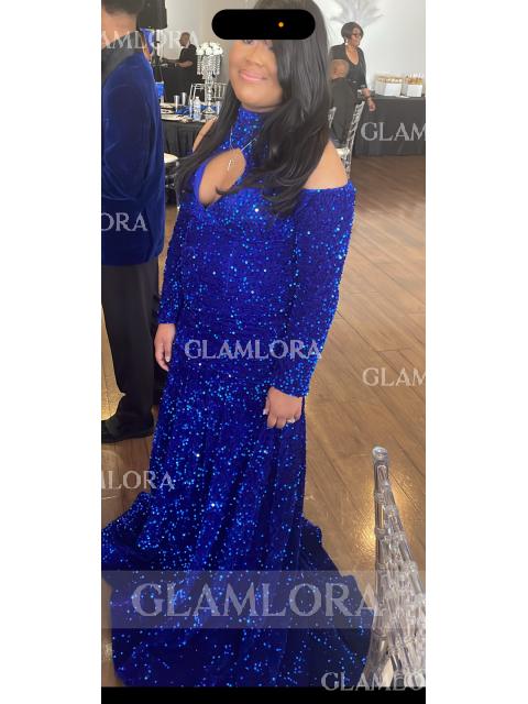 Warning: Undefined property: Product::$size_chart in /data1/www/glamlora-com.myamz2022.com/htdocs/controllers/front/ProductController.php on line 1066 Trumpet/Mermaid High Neck Long Sleeves Radiant Chapel Train Velvet Sequins Prom Dress - Glamlora