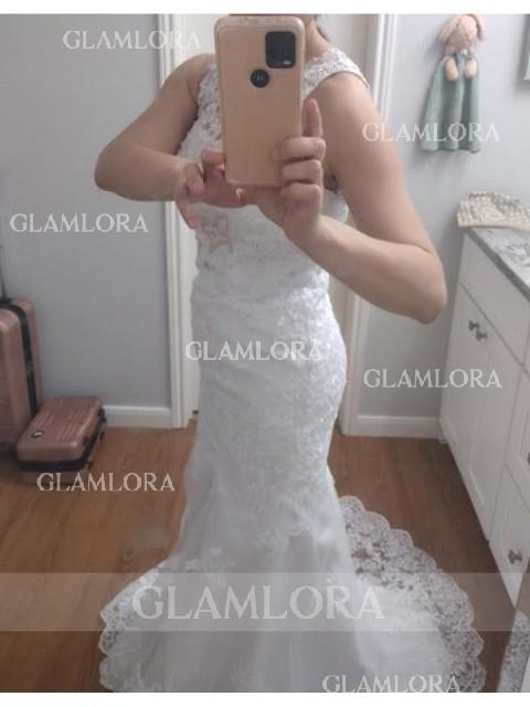 • Trumpet/Mermaid Scoop Sleeveless Court Train Figure-hugging Lace Wedding Dress With Applique