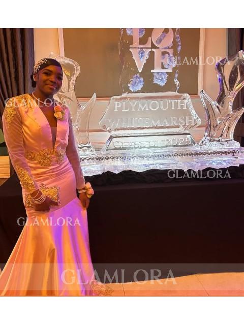 • Trumpet/Mermaid V-Neck Long Sleeves Court Train Glamorous Silk like Satin Prom Dress With Applique