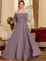 • Understated A-Line Chiffon Applique Off-the-Shoulder 3/4 Sleeves Floor-Length Mother of the Bride Dress