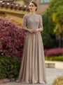 Understated A-line Scoop 3/4 Sleeves Appliques Lace Sweep Train Chiffon Mother of the Bride Dress
