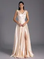 • Understated A-line V-Neck Pleated Floor-Length Satin Bridesmaid Dress
