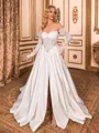 This elegant A-line wedding dress features a romantic off-the-shoulder neckline and long sleeves adorned with delicate lace appliques. Crafted from smooth satin, it is designed with a structured corset bodice for a flattering fit and flows into a graceful chapel train, combining timeless sophistication with refined elegance for the special day.