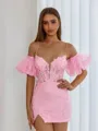 This sheath dress combines delicate spaghetti straps with short sleeves for a unique and stylish look. Adorned with intricate lace appliques, it exudes elegance and texture. The corset bodice defines the waist, and the short/mini length creates a modern, flattering silhouette - perfect for special occasions.