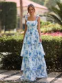 An elegant A-line bridesmaid dress with a square neckline and sleeveless design. The dress features cascading ruffles that add beautiful texture and movement, enhancing its soft, feminine silhouette. Made to flow gracefully to the floor, it has a corset back for a customizable and flattering fit. Perfect for a romantic and sophisticated wedding style.