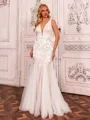• Unique Sheath V-Neck Appliques Lace Sweep Train Tulle Wedding Dress